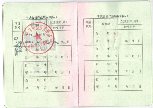 叉車司機-叉車證N1,電梯維修T,特種安全設備管理A,起重機指揮Q1,Q2起重司機(限門座式起重機),Q2起重司機(限橋式起重機),Q2起重司機(限門式起重機),Q2起重司機(限纜索式起重機),Q2起重司機(限塔式起重機)Q2起重司機(限流動式起重機)Q2起重司機(限升降機),觀光和觀光列出司N2,壓力容器壓力管道管理A,電梯管理A,起重機械管理A,場(廠)內(nèi)專用機動車輛管理A,工業(yè)鍋爐司爐G1,電站鍋爐司爐G2,鍋爐水處理G3,快開門式壓力容器操作R1,移動式壓力容器充裝R2,氣瓶充裝P,金屬焊接操作-壓力焊PE焊,非金屬焊接操作-壓力容器焊,食品檢驗員,化學檢驗員,農(nóng)產(chǎn)品檢驗員(4年一審,需要到期前3個月進行)從事特殊工種作業(yè)人員必須熟悉相應特殊工種作業(yè)的安全知識及防范各種意外事故的技能。要求從業(yè)人員持卡上崗,即由國家安全生產(chǎn)監(jiān)督管理局頒發(fā)《中華人民共和國特種作業(yè)操作證》方可上崗。