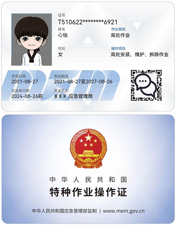 高空特種上崗操作證由應急管理部   頒發,哪里發的都可以通用的,以前叫IC卡,現在叫感應卡,3年年審一次,和身份證一樣的,只要你有專用的讀卡機,就能夠讀出卡里面的資料,但是這個讀卡機國家只給有資質的單位,比如學校,原安監,局應急管理局現等才有,這證不管你拿去哪里,只要有讀卡機的地方都可以讀卡與年審,查詢方式也可以上發證部門應急管理局的網站,上輸入證號查詢的。