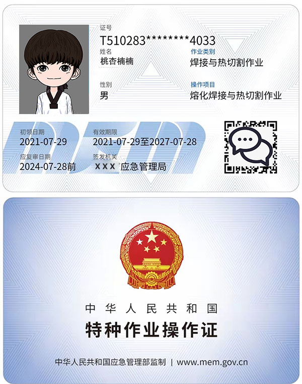 熔化焊接與熱切割作業(電焊、氣焊、弧焊、電焊氣割、其他),也叫上崗證和焊工證,發證機構、應急管理部 ,上崗必備證書,沒證書不予工作,分熔化焊接與熱切割作業,壓力焊作業,釬焊作業,證書帶磁卡,全國通用