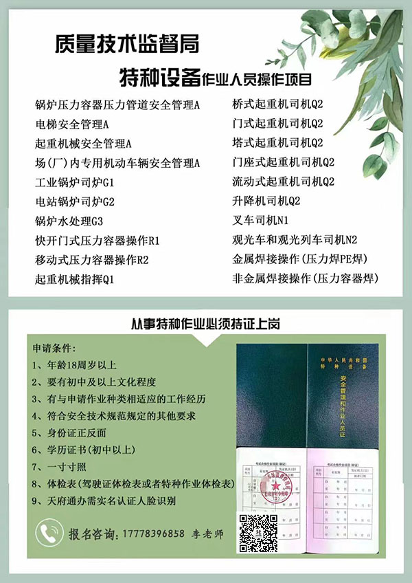 四川省質監局特種設備操作證:培訓考試報名熱線;177 7839 6858(微信同號),李老師 隨時報名,國網查詢,全國通用,高通過率。(全川40家合作機構和考試機構,方便快捷)