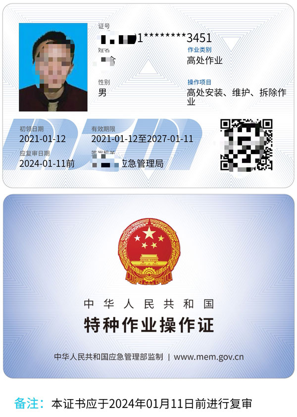 證書適用于利用專用設備進行建筑物內(nèi)外裝飾、清潔、裝修,電力、電信等線路架設,高處管道架設,小型空調(diào)高處安裝、維修,各種設備設施與戶外廣告設施的安裝、檢修、維護以及在高處從事建筑物、設備設施拆除作業(yè)。