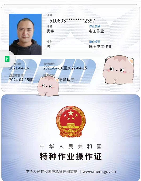 就是從事低壓電工作業的特種作業操作證。持有該證件,能從事低壓電工作業。即指1千伏一下(不含一千伏)的低壓電器設備進行安裝、調試、運行操作、維護、檢修、改造施工和試驗的作業。要求從業人員必須持卡(IC卡)上崗,此證書全國通用。